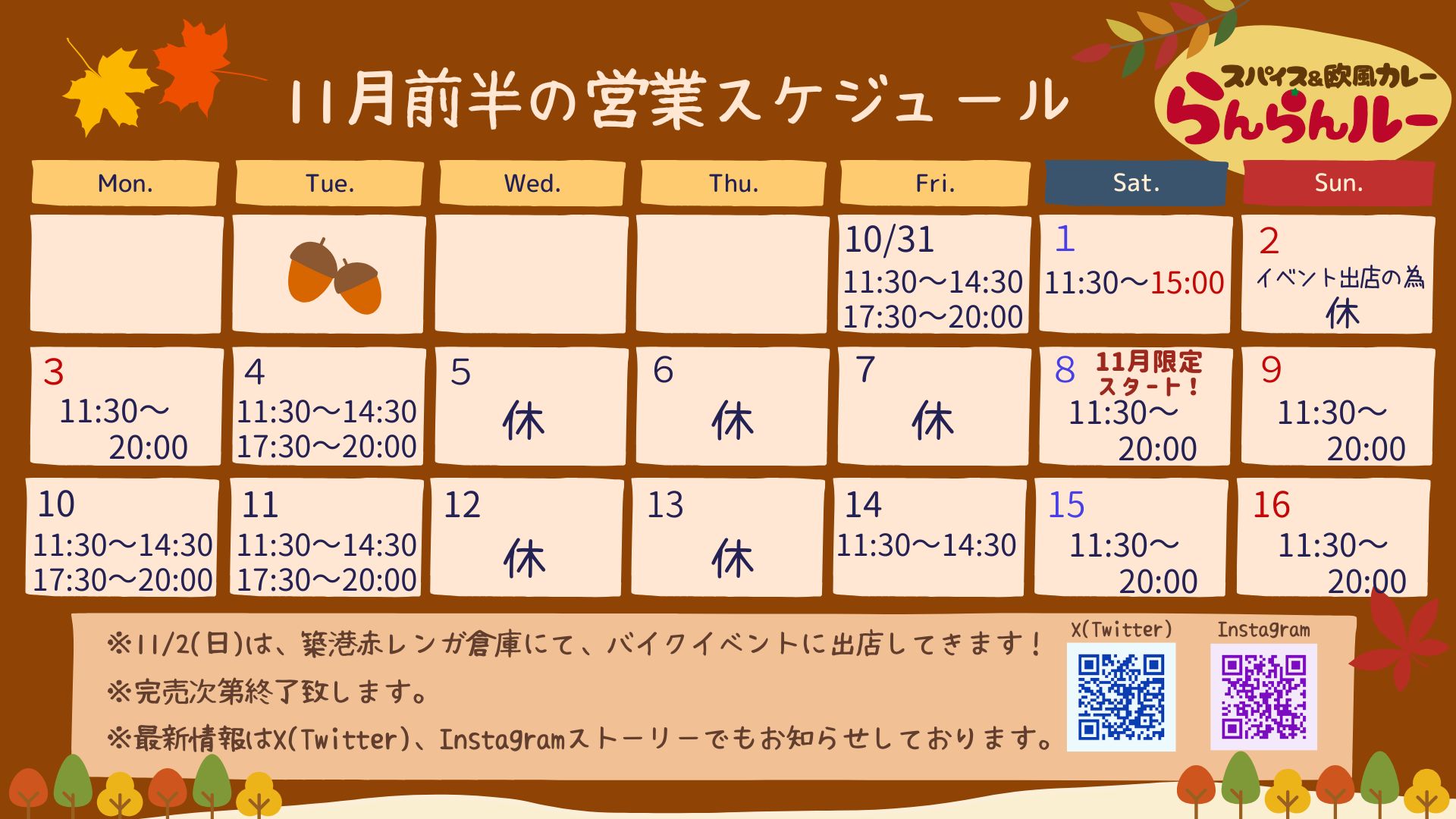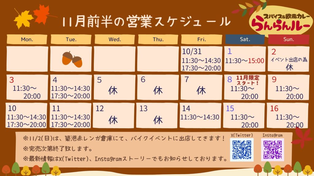 広告 11月前半のスケジュール/イベント出店のお知らせ 広告 2025.10.31 11月前半の営業スケジュールです! 11/2(日)は、築港赤レンガ倉庫にてバイクイベント「CBミーティング」に出店します! ジャンケン大会や、白バイ隊員さんによる講習・白バイ展示などもありますので、バイク好きの方是非♪ 詳細は下記画像をご覧くださいませ。 そのほか営業日も不規則となっておりますので、カレンダーにてご確認の程よろしくお願いいたします(。>人<。) 11月もお待ちしております!