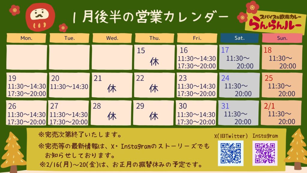1月後半の営業カレンダーです!