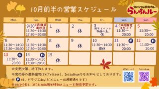 らんらんルーのお知らせ 10月前半のスケジュール 10月前半の営業スケジュールです!・6周年イベント準備等のため、金曜が不規則になります<(_ _*)>・6周年イベントは... 2025.09.30 らんらんルーのお知らせ