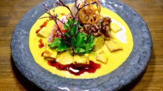 ナッツのペーストや生クリーム、ヨーグルトなどを使用した北インド料理、コルマ。らんらんルーのコルマは特に濃厚クリーミー。今回は洋食のおかずを合わせました。タルカソースや秘密のクリームソースも相性抜群!/大阪市中央区谷町六丁目、空堀商店街のカレー店 らんらんルー