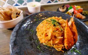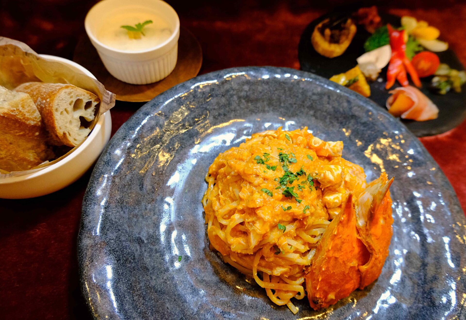 蟹ミソから爪の先まですべて、渡り蟹まるごと1匹を使用して贅沢なトマトクリームソースに仕上げます。
